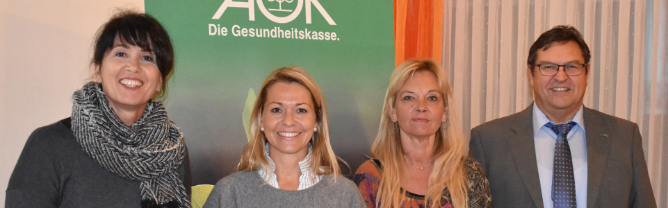 Sprachen gemeinsam über die Schilddrüse: Eva Wirthgen-Beyer (v.l.), Bianca Schacherer, Andrea Teves vom DONAUISAR Klinikum und Peter Wagner von der AOK. Foto 2: Zahlreiche Zuhörer interessierten sich für die Auswirkungen des kleinen Organs.