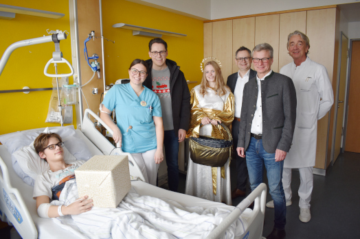 Philipp freute sich über den Besuch des Christkinds. Auch wenn er schon etwas älter ist, war der Besuch ein Lichtblick. Mit dabei Schwester Elisa Eißerl (v.l.), Oberbürgermeister Dr. Christian Moser, Sparlassenvorstand Stefan Swihota, Landrat Bernd Sibler und Chefarzt Dr. Michael Mandl.