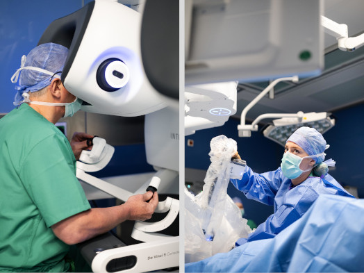 Arbeitsteilung im OP-Saal: Während Chefarzt Professor Dr. Matthias Behrend von der Arztkonsole aus den Eingriff steuert, tauscht Assistenzärztin Raphaela Häring bei Bedarf die OP-Instrumente an den Roboterarmen aus.
