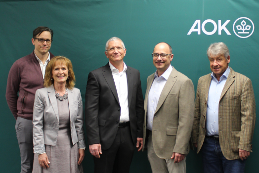 Warben gemeinsam für die vorsorgliche Darmspiegelung: Chefarzt PD Dr. Christian Bauer (v. l.), AOK-Ernährungsberaterin Christa Katzdobler, Prof. Dr. Matthias Behrend, Prof. Dr. Markus Radsak und AOK-Direktor Jürgen Beck. (Foto: DONAUISAR Klinikum)