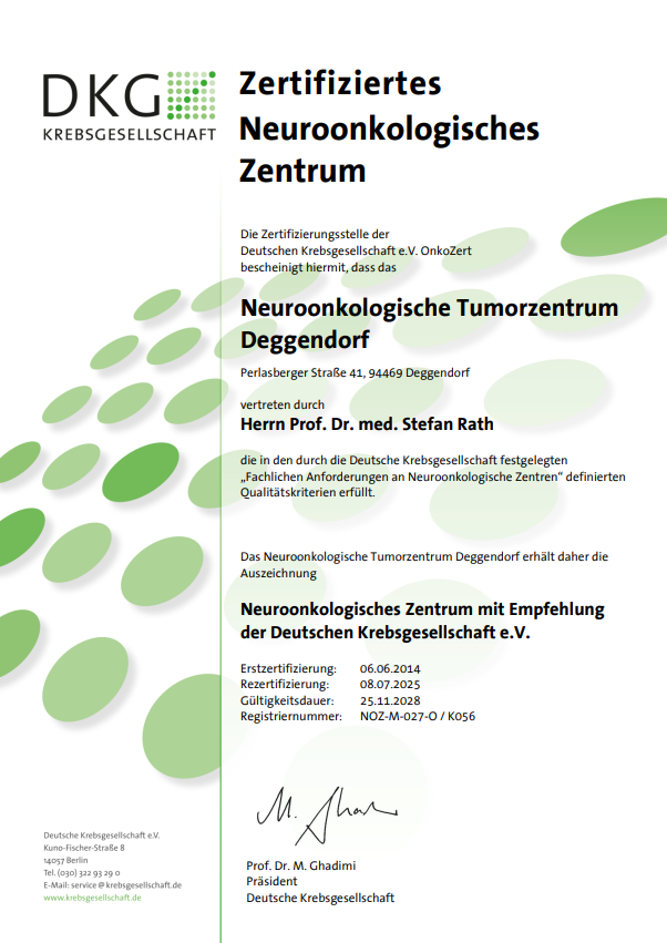 Da ein solches Zusammenwirken der verschiedenen Disziplinen an unserer Klinik für die Behandlungserfolge oberste Priorität hat, wurde am Donau-Isar-Klinikum Deggendorf das Neuroonkologische Zentrum gegründet und gehört zu den wenigen von der Deutschen Krebsgesellschaft e.V. zertifizierten Neuroonkologischen Zentren in Deutschland.