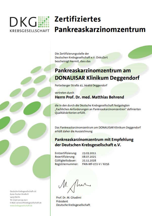 Alle für die Diagnostik von Bauchspeicheldrüsenerkrankungen wichtigen, bildgebenden Methoden werden durchgeführt. Es besteht eine hochmoderne, leistungsfähige Endoskopieeinheit, die das gesamte Spektrum der endoskopischen Untersuchungen und Eingriffe an der Bauchspeicheldrüse abdeckt. Sollte nach sorgfältiger Abwägung die Notwendigkeit einer Operation gegeben sein, wird diese von den erfahrenen Chirurgen der Allgemein-, Viszeral- und Gefäßchirurgie unter Verwendung moderner Operationsmethoden durchgeführt.